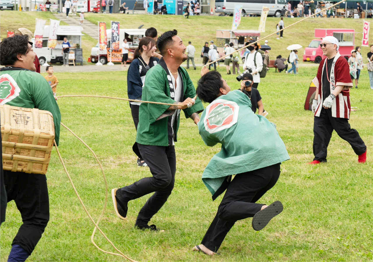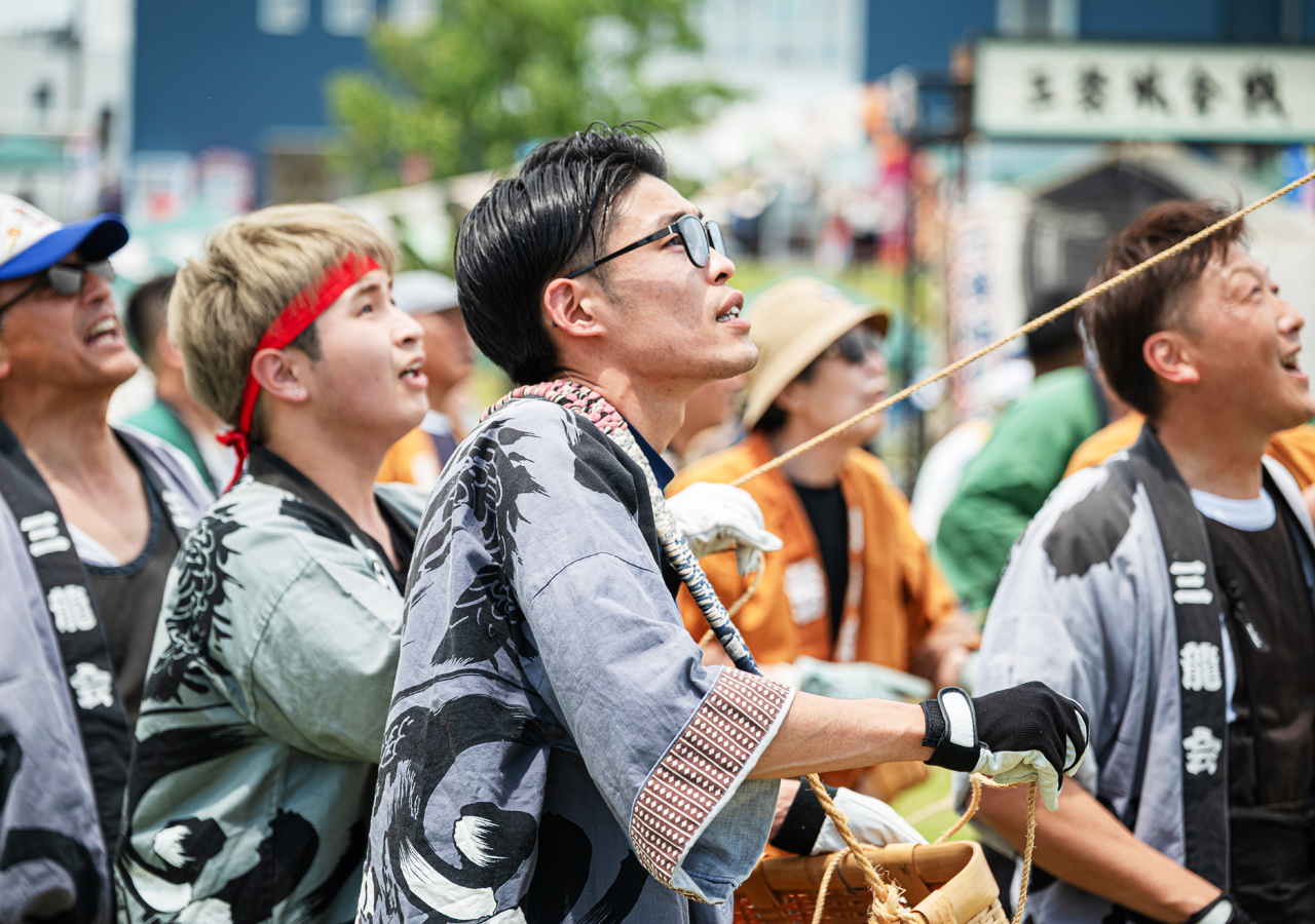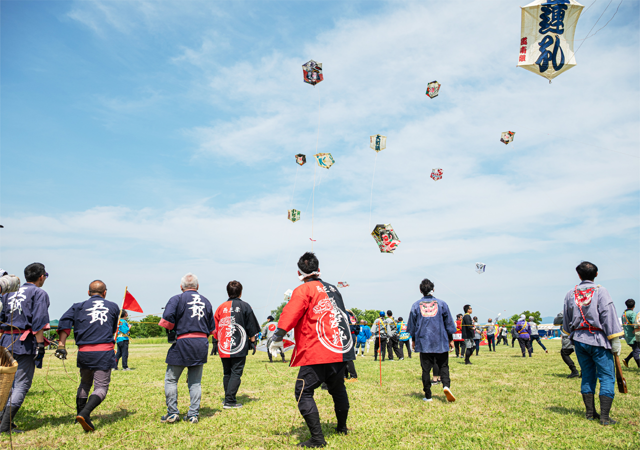 守門おろしを肩背にうけて、天高く空へ舞い上がる。 武者絵の六角巻凧が、好敵手の凧糸を切らんと勇ましく立ち向かう。 年に一度の合戦の幕が、三条であがる。